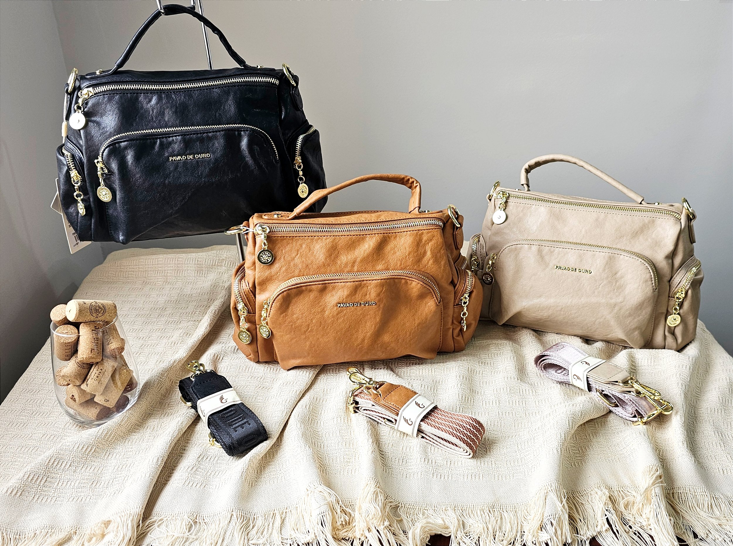 Bolsa média com bolsos externos e internos, detalhes nos zíperes com alça sobressalente regulável.