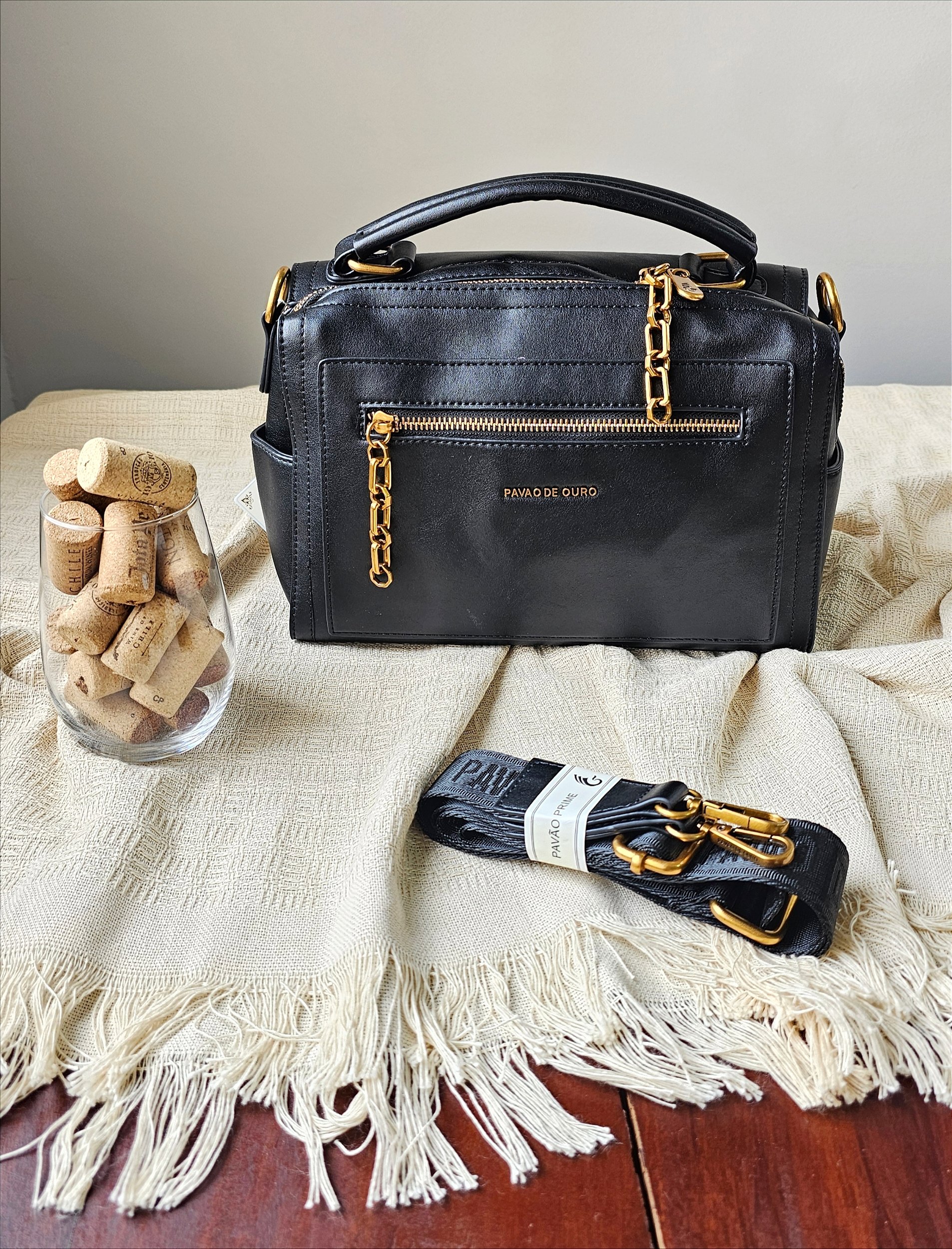 Detalhes em Dourado: Os zíperes, fechos e, principalmente, a corrente decorativa em elos dourados elevam o design, adicionando um ponto de luxo e elegância.