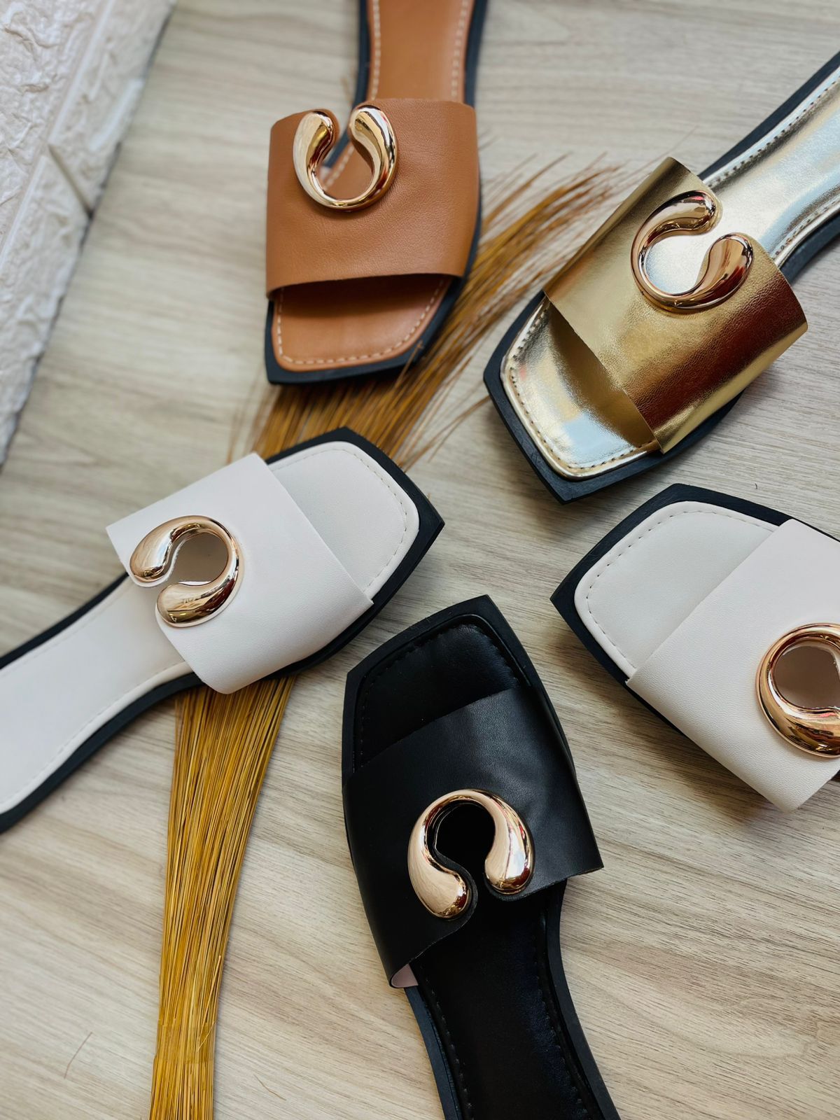 Rasteirinha com detalhe dourado, frente quadrada e palmilha confort.