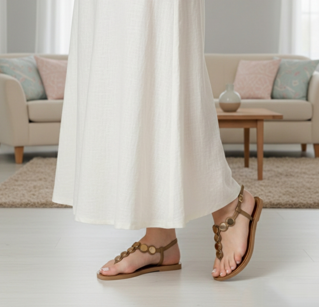 Versatilidade Imbatível: A cor neutra e os detalhes metalizados garantem que ela combine perfeitamente com tudo, desde vestidos leves (como o da foto) e saias fluidas até shorts e calças de linho.