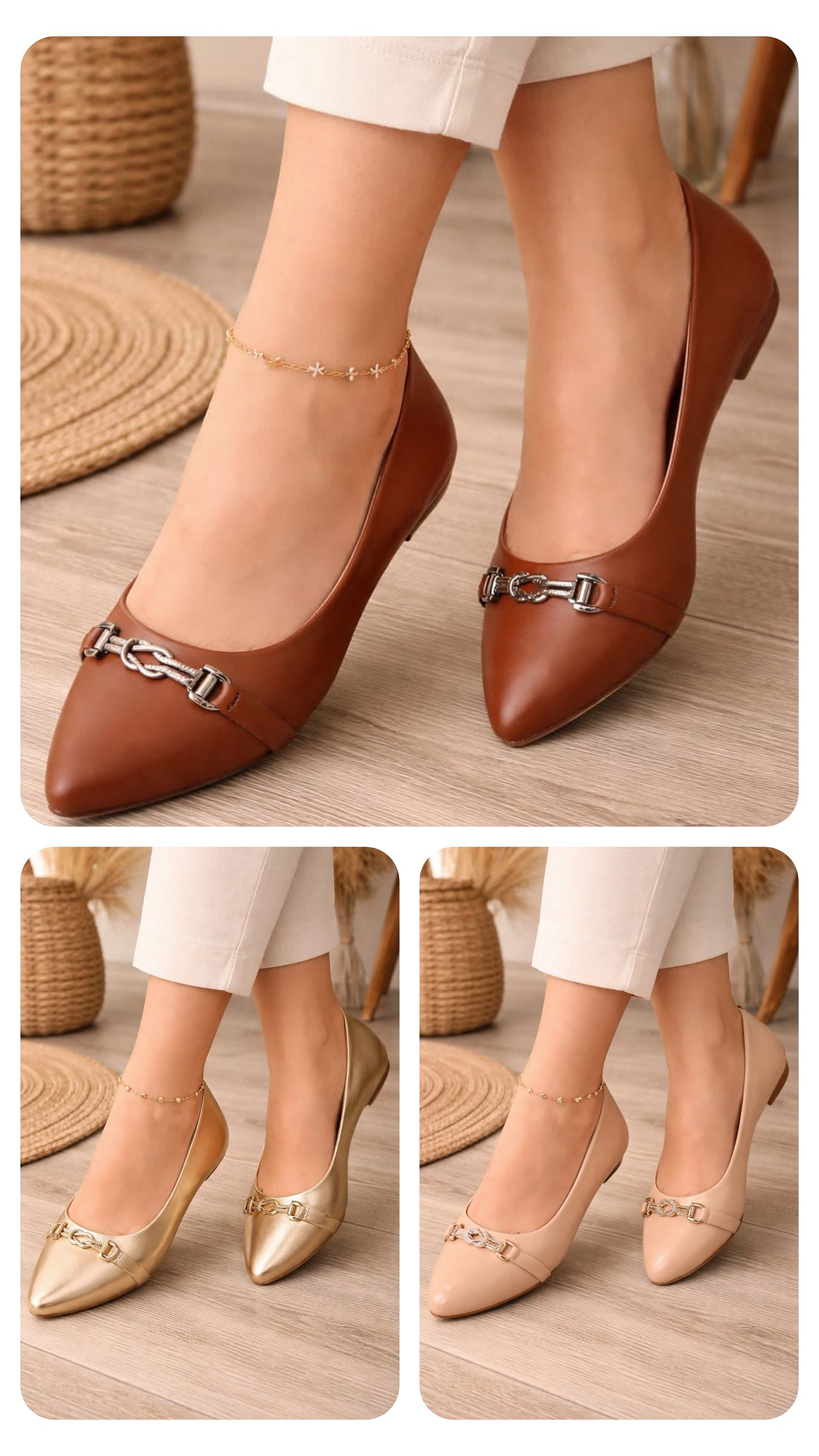 Sapatilha com detalhe dourado, bico fino e palmilha confort.
